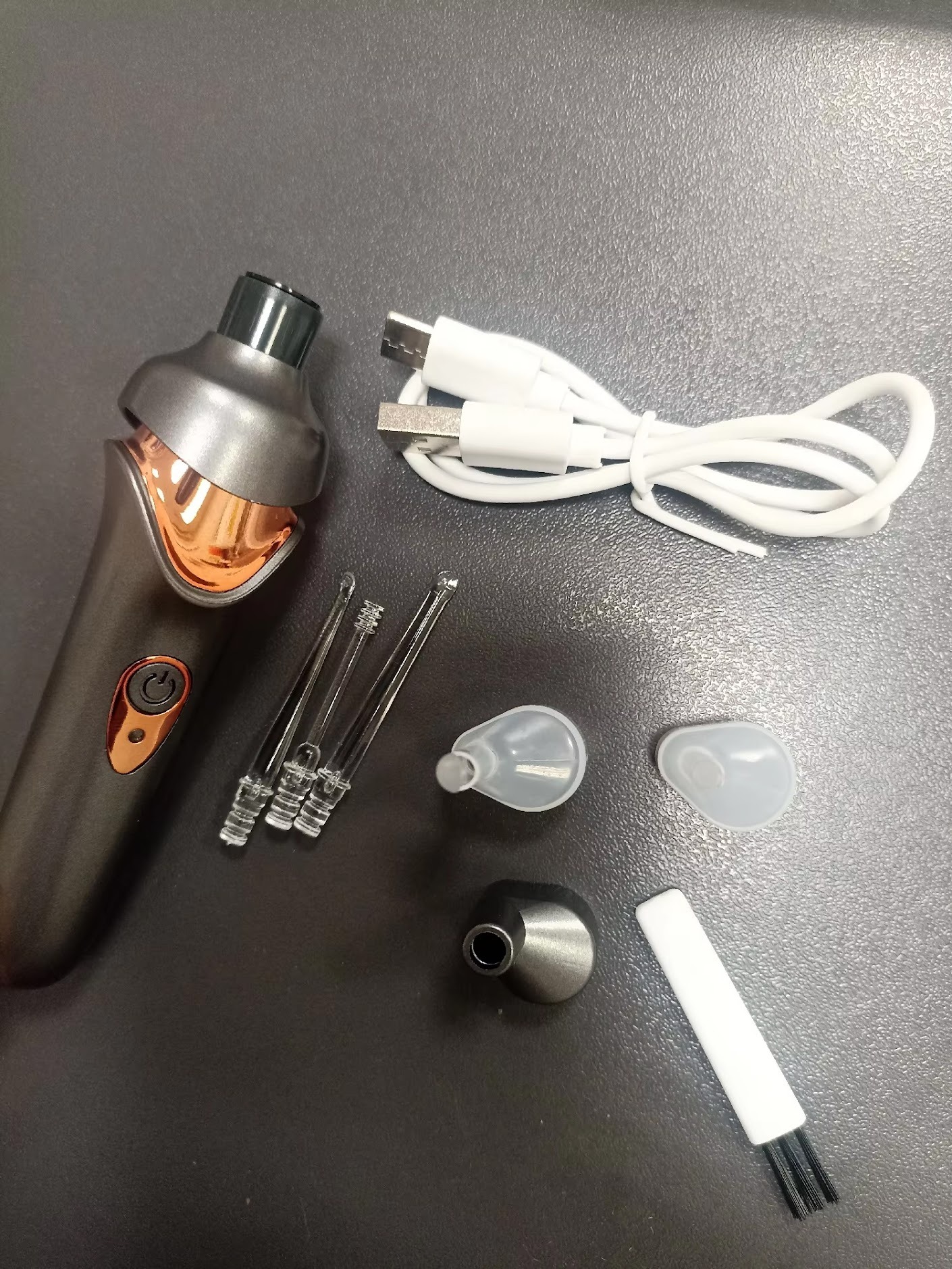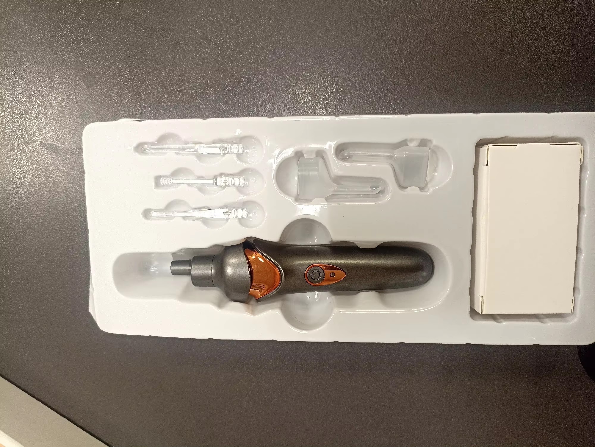Neat and quickly delivered everything properly Have tested it and it works well takes all the dry bits out of your ear!!